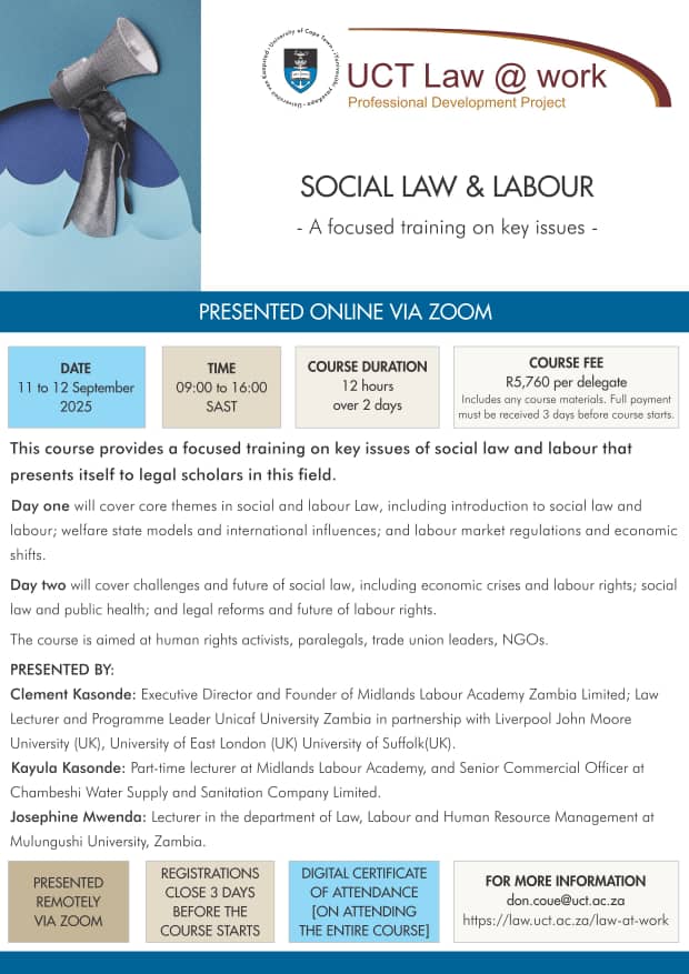 Course CollaborationUCT Law @ Work Professional Development Project featuring Clement Kasonde as co-presenter for "Social Law & Labour" course (September 2025) in partnership with UK universities.